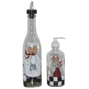 Product Description : Hand painted pour bottle set features an adorable chef accompanied by his tools of the trade. Dressed in his white apron and traditional chef's hat, he's ready to prepare your favorite meal. Brighten up your kitchen by putting these lovely containers ON the counter, not under it. Can be used for condiments and/or liquid soap. Hand painted, made to order and signed by artisan. Perfect as a gift or for your own home. Usually ships within 3 to 5 days from receipt of order. MADE IN AMERICA.