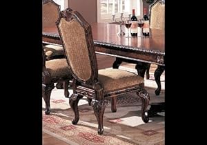 Product Description : Set of 2 European Style Saint Charles Collection Dining Side Chair /Chairs This is a set of 2 dining side chairs from the Saint Charles collection. In the grand European tradition of elegance, Saint Charles collection is crafted from Ash Burl veneers and selected solid hardwoods. The seat cushions are made of gold patterned fabric, well built and durable. Stylish, elegant, and perfect for any classic home decor. Item requires simple assembly. Purchase includes 2 chairs. Specifications - Dimensions: 19-3/4"W, 21-1/4"D, 42"H - Style Type: European Style - Materials: Wood - Color: Brown - Pieces: 2 - Finish: Brown